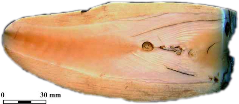 Publicado el viernes/09/05/2014miércoles/19/11/2014 por artepaleoliticoenasturias Las inclusiones de osteodentina son características de los dientes de grandes cetáceos.