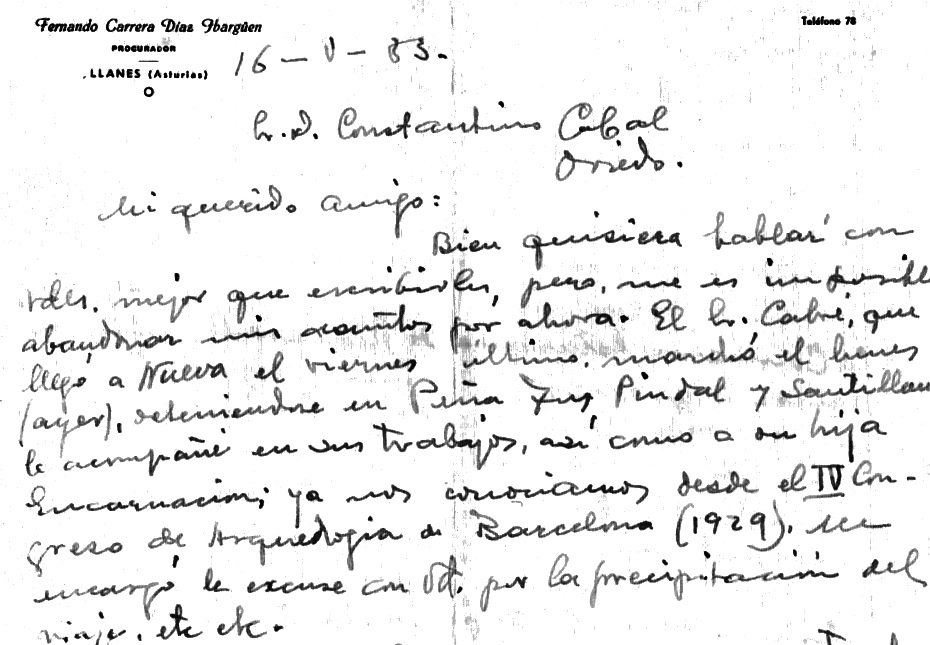 Este último comentario nos da la clave de la identificación, dado que los tres personajes que acompañan a Encarnación en la fotografía de Socampo serían los mencionados Carrera, Díaz y Sánchez. Una carta de Fernando Carrera dirigida a Constantino Cabal, fechada el 16 de mayo de 1933, conservada en el archivo de la Comisión Provincial de Monumentos (figura 4), confirmaría lo expresado por Cabré: