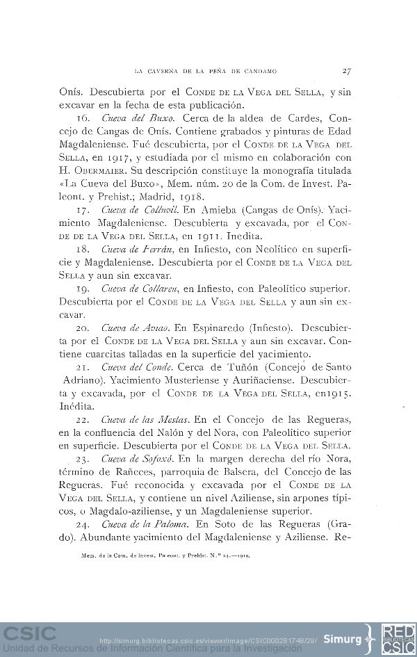 - MÁRQUEZ URÍA, María del Carmen. “Trabajos de campo realizados por el Conde de la Vega del Sella”. Boletín del Instituto de Estudios Asturianos, 83, 1974, p. 811-835.