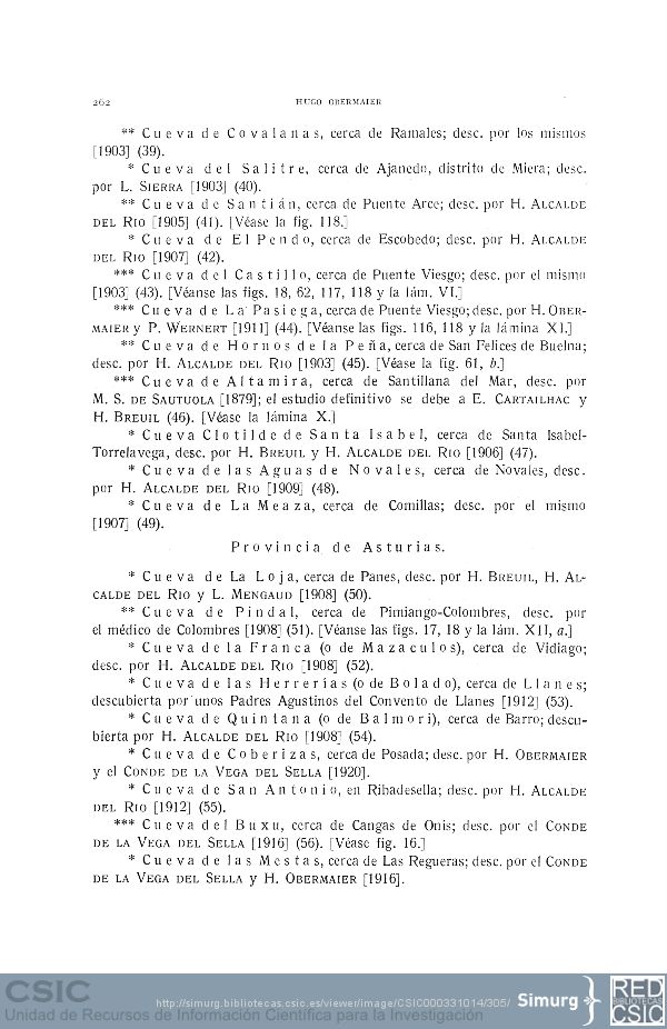 - OBERMAIER, Hugo. El Hombre Fósil. Comisión de Investigaciones Paleontológicas y Prehistóricas, 2ª ed. Madrid, 1925.